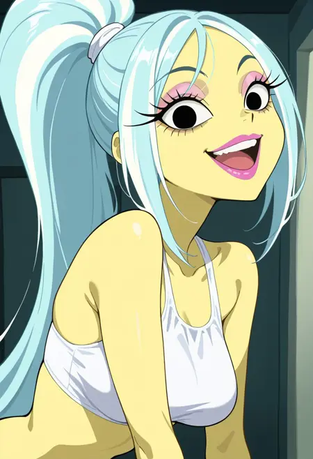 sirenSJ1_IL: 길고 곧은 머리카락, 아쿠아 블루 머리카락, 흰색 스트라이프, 흰색 큰 고리 귀걸이, 흰색 팔찌, 흰색 크롭 비키니 상의, 흰색 속옷, 흰색 허벅지까지 오는 부츠