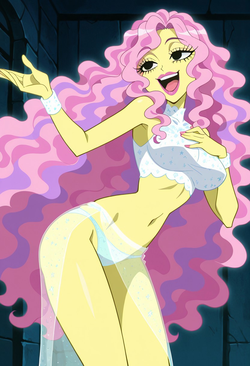 sirenSJ2_IL: 길고 곱슬 곱슬한 머리카락, 분홍색 머리카락, 보라색 스트라이프, 흰색 팔찌, 흰색 다이아몬드 무소매 크롭 탑, 연한 파란색 속옷, 투명한 치마
