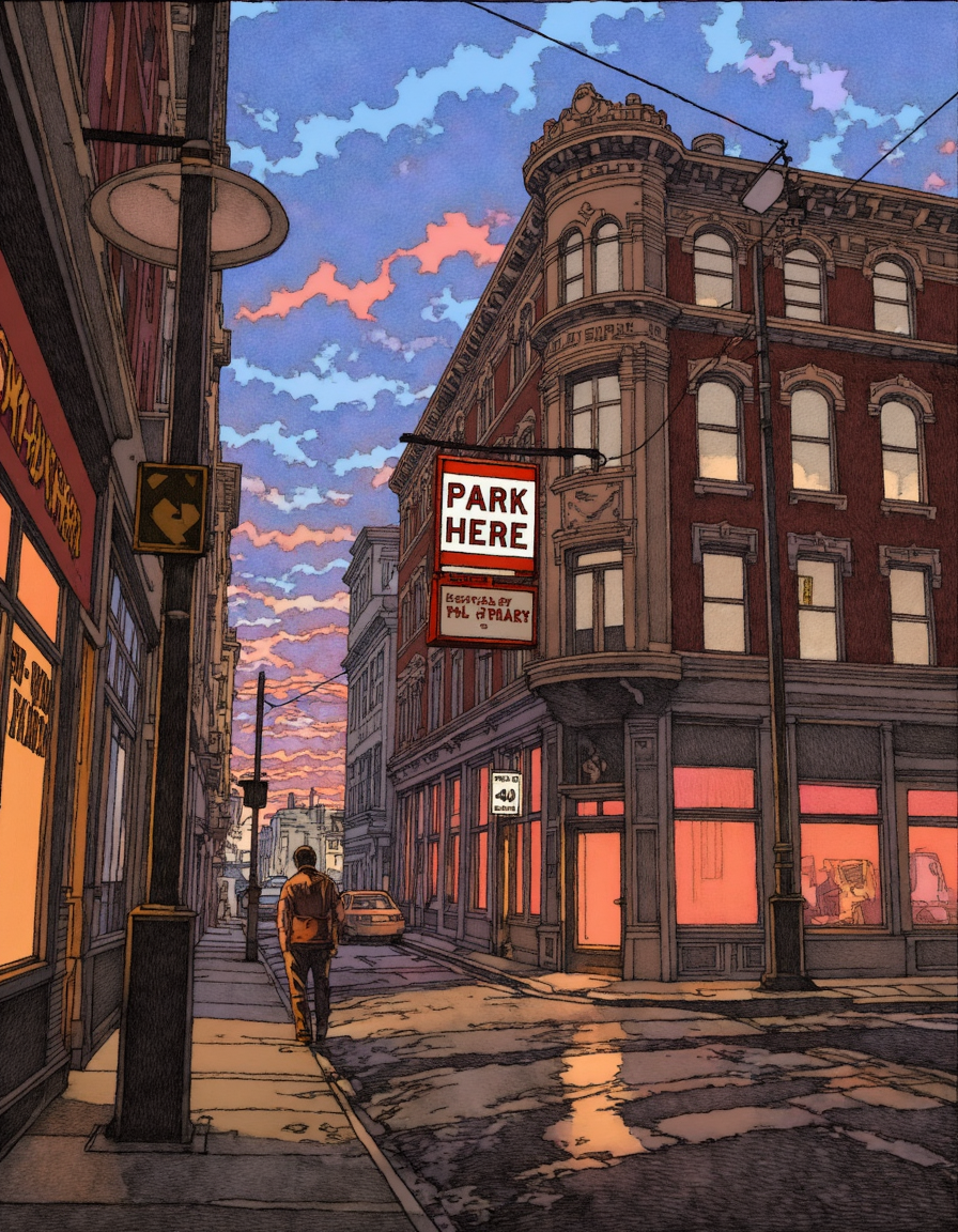 흰색 셔츠에 팔을 걷어붙인 남자가 도시 건물들 사이에 서서, 푸른 하늘 아래 부드러운 파스텔 톤의 배경 속에서 "Little City Market Selected Meats"라고 쓰인 큰 빨간 네온 사인을 바라보고 있는 일러스트. 풍경은 따뜻한 햇빛과 날카로운 그림자로 가득하여 myles-hyman 스타일로 옛날 분위기를 연출합니다.