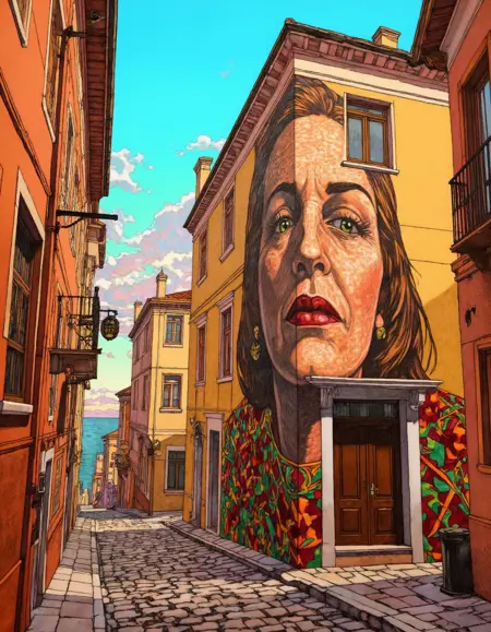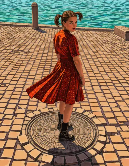 빨간 드레스와 선글라스를 착용한 여성이 고전적인 다이너 앞에 자신감 있게 서 있는 일러스트. 그녀 위에는 "EAT"라는 단어가 두꺼운 네온 조명으로 표시되어 있고, 밝은 푸른 하늘이 강한 대비를 이룹니다. 반사되는 창문을 가진 중세기 건축물은 따뜻한 오후 햇빛으로 부드럽게 조명되어 있으며, 이 모든 것이 myles-hyman 스타일로 표현되었습니다.