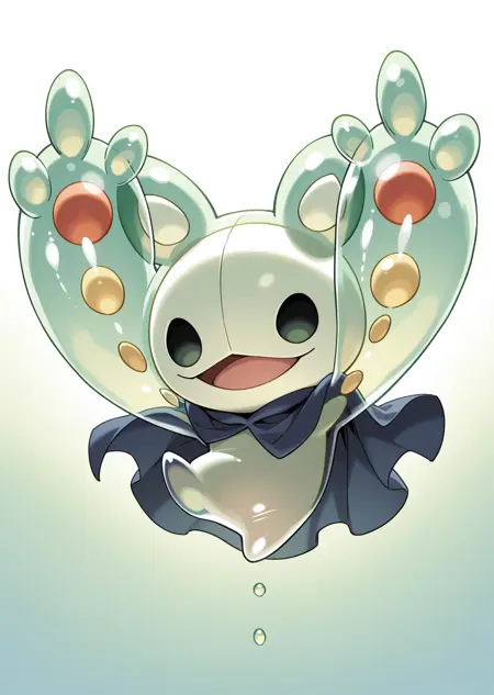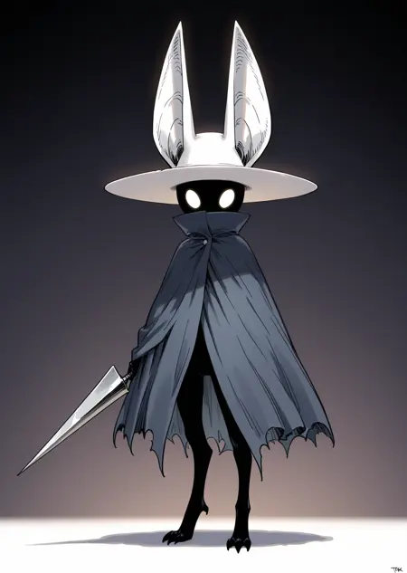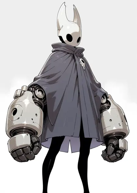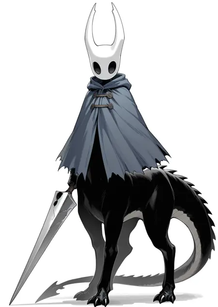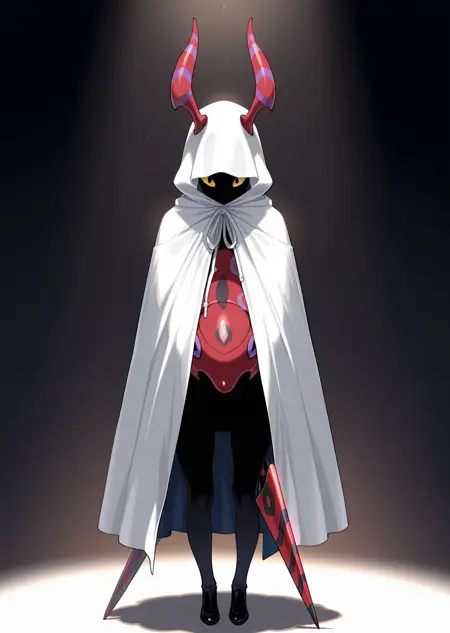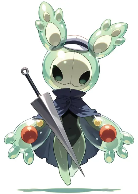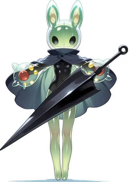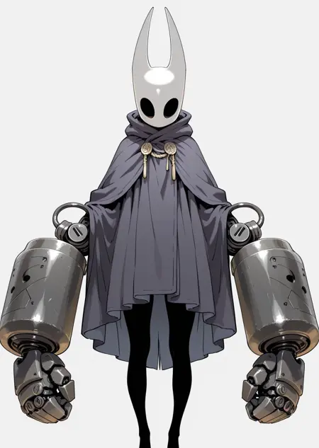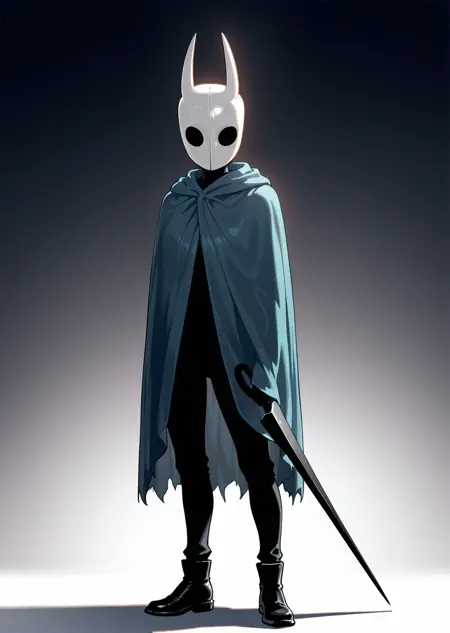Prompts: hollow knightification, white headwear, weapon, cloak,