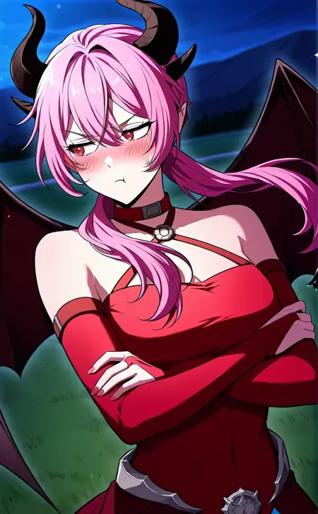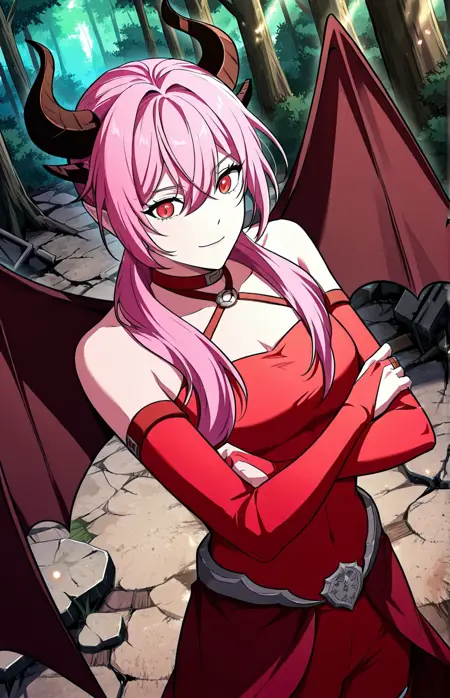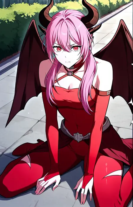 Kyuva, demon girl, 1girl, solo, red eyes, pink hair, long hair, uneven bangs, hair between eyes, sidelocks, horns, demon wings,