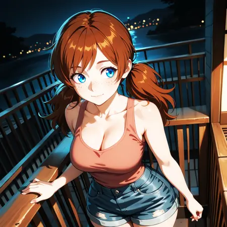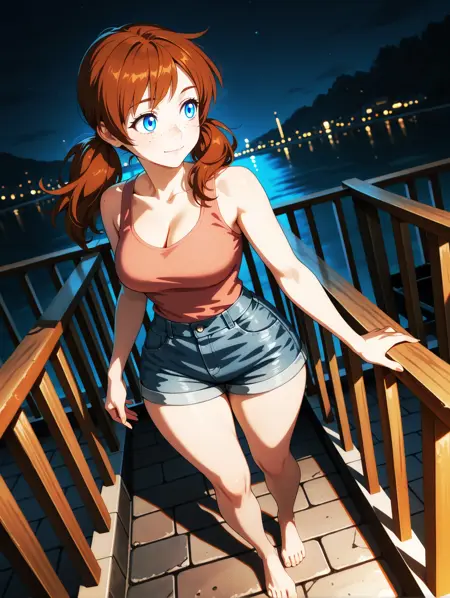 복장 프롬프트: 탱크탑, 반바지, 청바지, 어깨 노출, 짧은 반바지, 셔츠, 청바지, 파란 반바지, 소매 없음, 가슴 노출