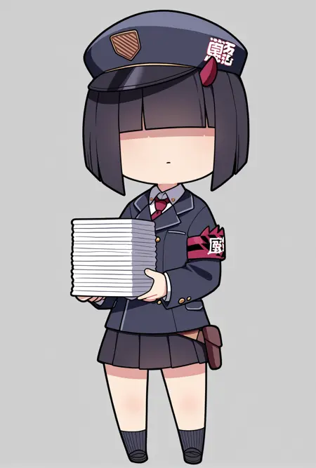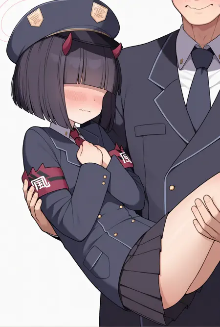 Positive: prefectmobba、ボブカット、帽子、無表情な女性、角、ブランクの前髪、腕章、ジャケット、プリーツスカート、シャツ