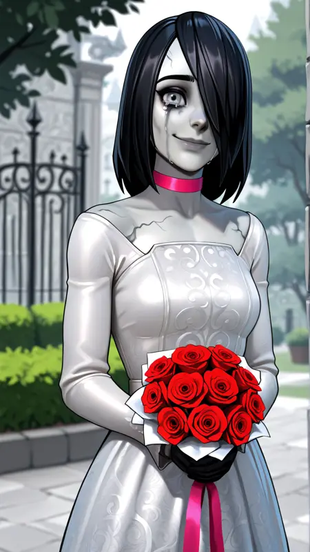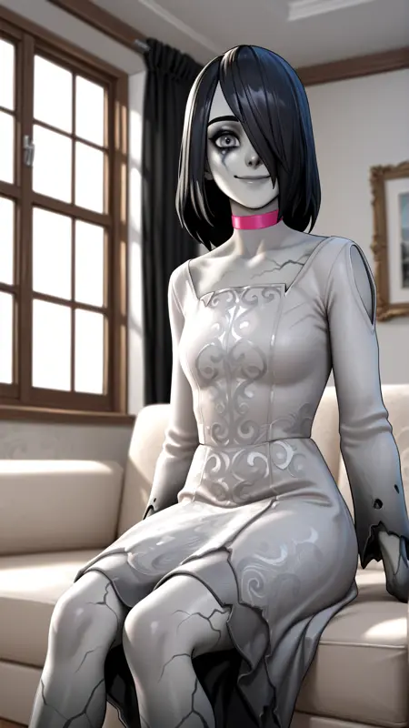 1girl, w1llow, colored skin, grey eyes, black hair, hair over one eye, choker, grey skin, dress, w1llow_mask
