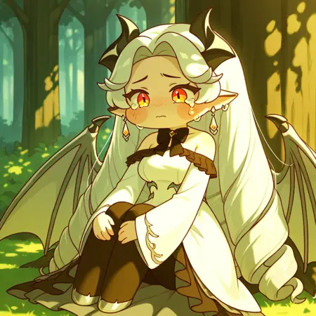 태그: 1소녀, 중간 크기 유방, 드래곤 날개, 검은 뿔, 흰색 드레스, 귀걸이, 매우 긴 머리카락, 검은 팬티스타킹, 뾰족한 귀, 긴 소매, 검은 리본넥타이, 흰색 머리카락, 주황색 눈, 어깨 드레스, 하이-로우 스커트, 넓은 소매, 쿼드 드릴, 치비, 블러쉬 스티커