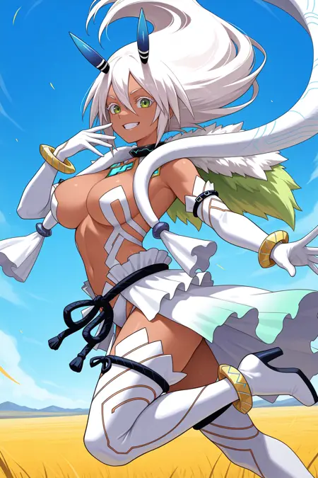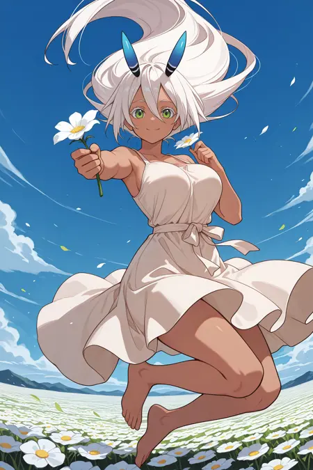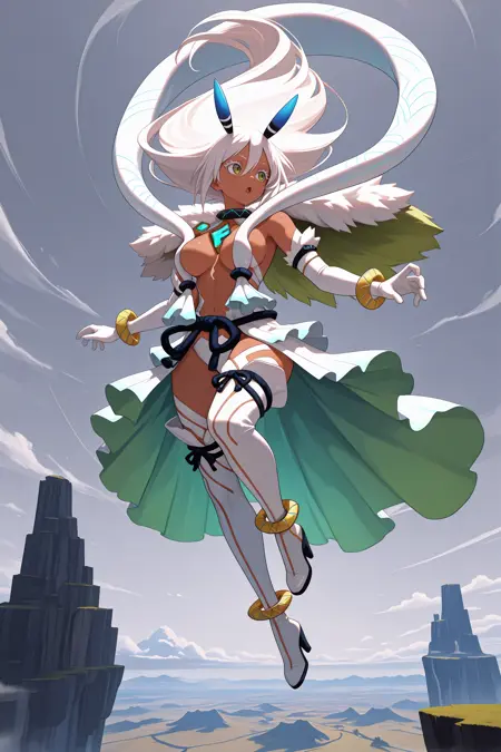 トリガーワードは「xcznb」、また「暗色肌の女性、青い角、白髪、長い髪、浮く髪、眉間の髪、緑の目、白いまつげ」が必要です。