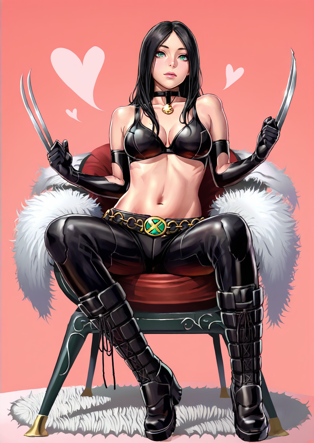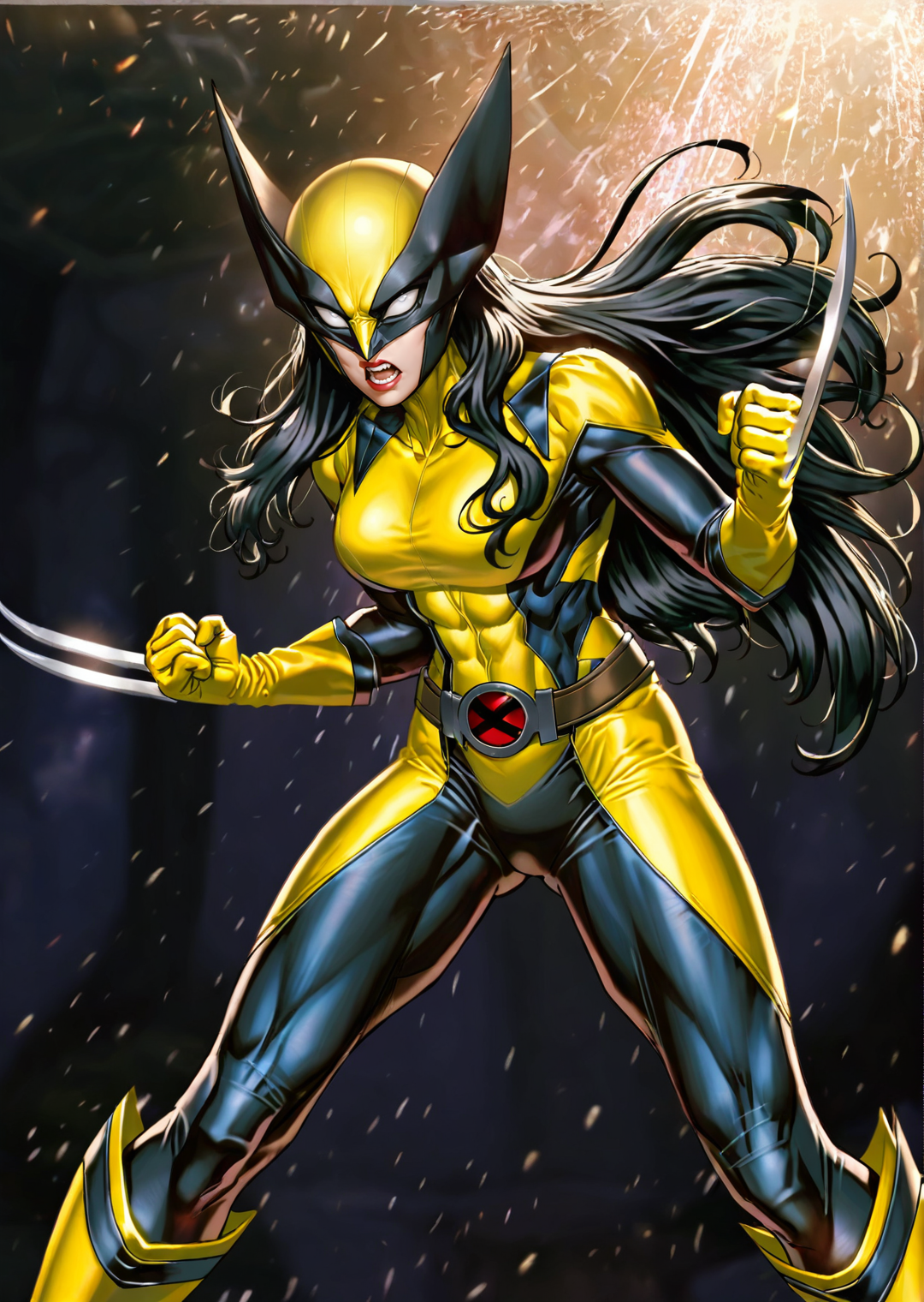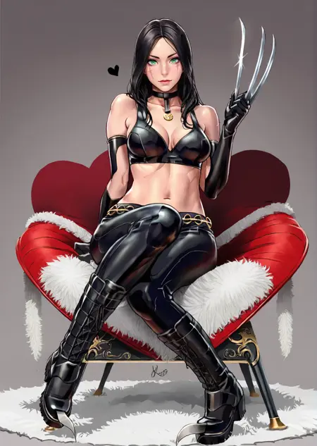 | 训练词汇 | x23, 1girl, solo, long hair, black hair, navel, cleavage, bare shoulders, medium breasts, green eyes, belt, elbow gloves, midriff, black footwear, bra, lips, black choker,knee boots, claws, bikini top only, claw (weapon), black gloves, black pants已复制! x23, 1girl, solo, long hair, black hair, medium breasts, mask, knee boots, clenched hand, claws, skintight, muscular female, fighting stance, black bodysuit, red lips, white eyes, yellow footwear, superhero, yellow gloves, spandex, yellow bodysuit, western comics (style), lips已复制! |