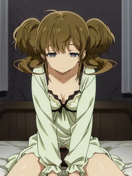 lyn, brown hair, short twintails, bangs, grey eyes,pink pupils, small breasts, mature female, anime screenshot,