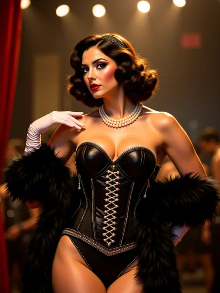 The style emphasizes strong contrasts, spotlight lighting, and a sense of playful sophistication — blending glamour, humor, and theatrical detail into every image. Whether portraits, full-body performances, or accessories, this LoRA gives your creations the charm of smoky cabaret halls and cinematic black-and-white photography.