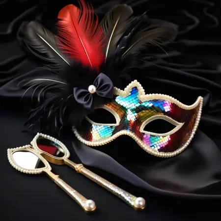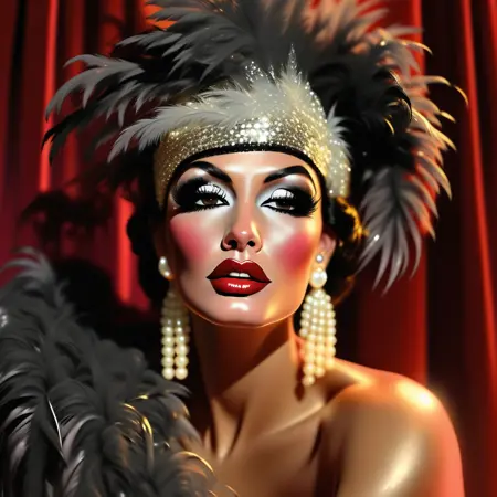 Expect sequined corsets, satin gowns, feather boas, pearl jewelry, tuxedos, velvet curtains, golden tassels, and the theatrical glow of art deco stages. Women appear as radiant showgirls or singers with bold makeup and dramatic poses, men as charismatic masters of ceremonies or slapstick comedians, and animals as surreal burlesque performers in costumes and accessories.