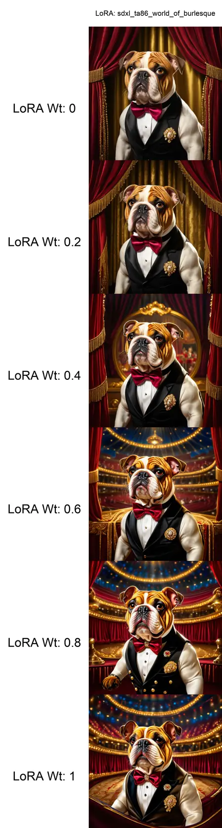 This LoRA captures the dazzling world of American burlesque in the 1930s — a glamorous mix of theater, cabaret, and vaudeville spectacle. Designed as a morph-style LoRA, it transforms characters, animals, or even objects into the shimmering aesthetics of vintage burlesque without altering the entire scene.