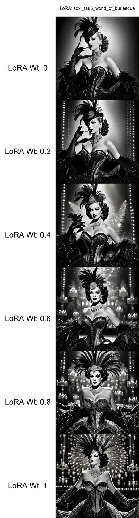 The style emphasizes strong contrasts, spotlight lighting, and a sense of playful sophistication — blending glamour, humor, and theatrical detail into every image. Whether portraits, full-body performances, or accessories, this LoRA gives your creations the charm of smoky cabaret halls and cinematic black-and-white photography.
