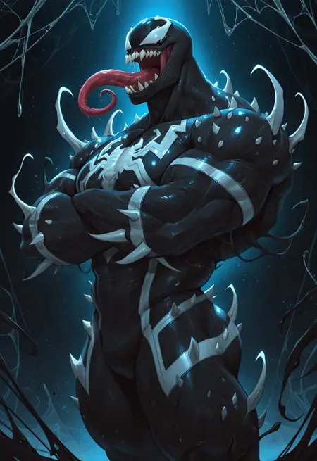 venomRealms_/(comic)/IL, symbiote, claws, paws, 1boy, solo, long tongue, mouth, sharp teeth, spider print, body suit, black suit,