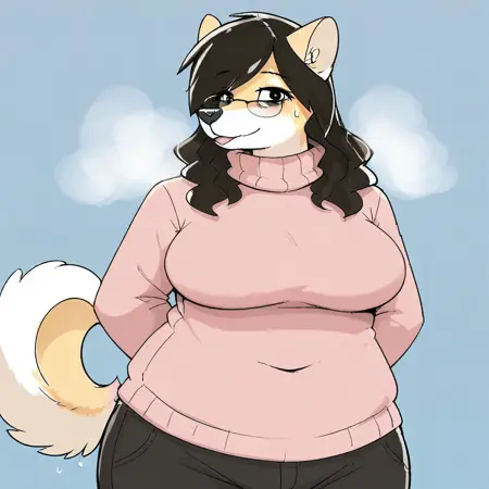 dog, dog girl, shiba inu, tan and white fur, black hair, long hair, black eyes, black nose, curled dog tail, mature female, chubby, large breasts, glasses,