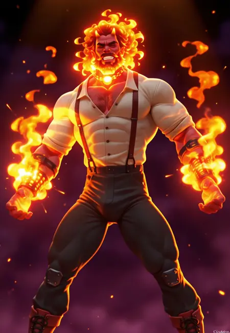 吉迪恩·煤,吉迪恩,阿万特里斯传说,火元素裔,男性,1个男孩,恶魔,恶魔角:2.0,高大男性,健壮, bara,红色皮肤,发光余烬发丝,火焰发梢,胡须,火焰胡须尖端,深棕色头发,余烬发,发光发根,吸烟斗,红色胡须,面部毛发,发光余烬,红色眼睛,手铐,沉重锁链,发光锁链,束缚锁链,配饰,前臂护腕,脏白色衬衫,敞开衬衫,背带,红色背带,黑色长裤,黑色裤子,红色靴子,皮革靴子,武器锁链,奇幻,强健体格,