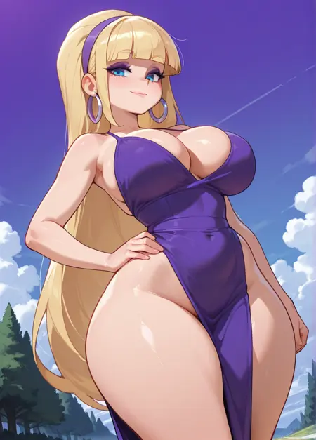 pacificaxd, 1girl, earrings, blunt bangs, blonde hair, jewelry, long hair, hoop earrings, blue eyes, ponytail,