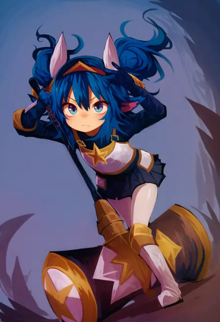 角色特征: 稳定生成她的约德尔人身材、鲜艳的蓝色肌肤,以及标志性的紫色双马尾发型。