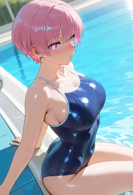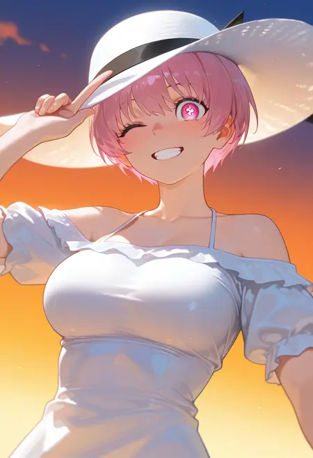 외모 태그: 1girl, solo, 단발, 분홍색 머리, 분홍색 눈, 큰 가슴, 밝은 동공, 기호 모양의 동공, 흰색 동공,