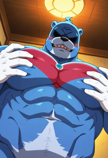 Serious Mode Reinforcement Prompt: "furry, blue fur, blue hair, otter ears, chest tattoo, purple tail, no eyes, shaded face, sharp teeth, white hands, muscular, masculine, bara, large pectorals, alternate pectoral size"