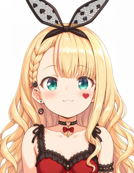 mononobe alice \(punkstyle\), rabbit ear hairband, streaked hair, braided bangs, hairpin, earrings, facial mark, green eyes, very long hair, blonde hair, wavy hair, choker, collarbone, arm strap, wristband, pink nails, camisole, navel, highleg panties, plaid skirt, fishnet thighhighs, thigh strap,
