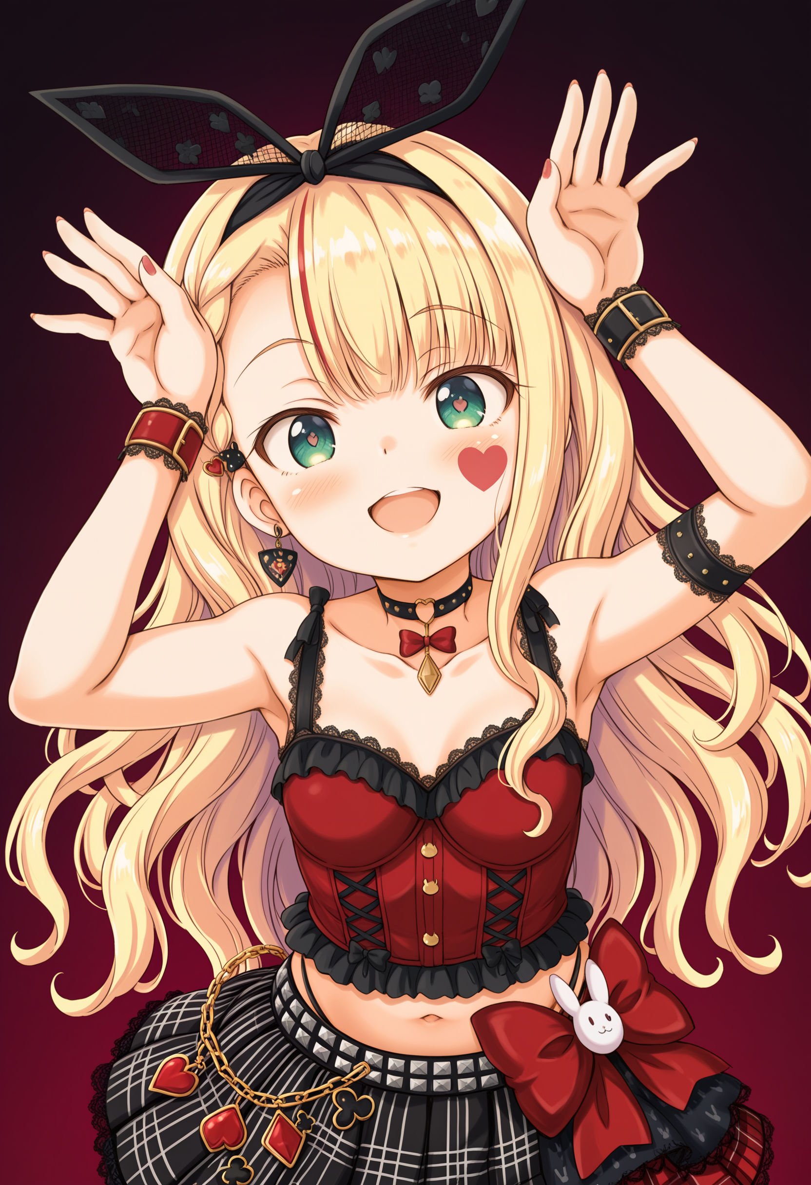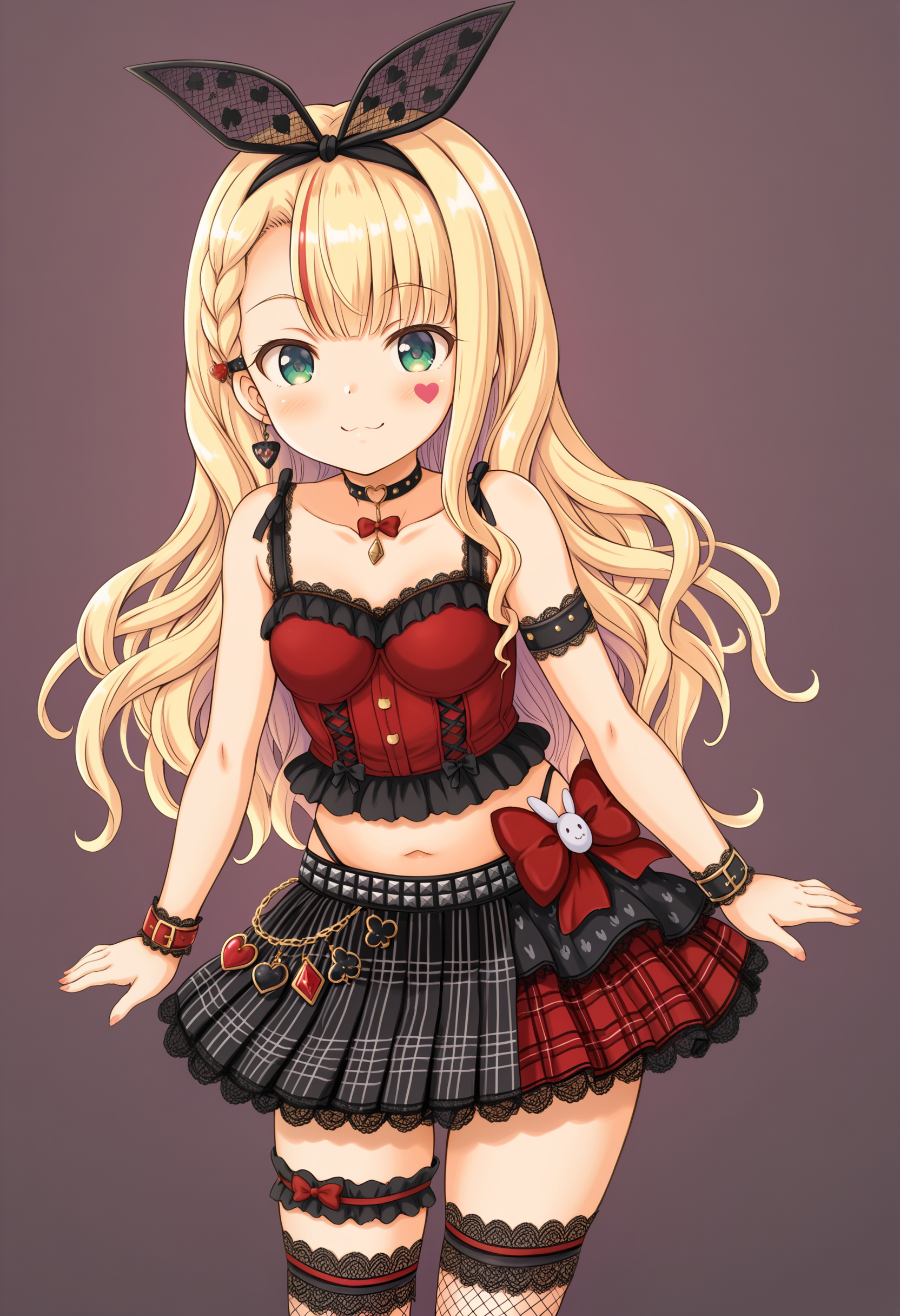 mononobe alice \(10th costume\), rabbit ear hairband, streaked hair, braided bangs, hair ornament, single earring, heart facial mark, green eyes, long hair, blonde hair, wavy hair, heart ring choker, collarbone, arm strap, wristband, pink nails, midriff, navel, highleg panties, plaid skirt, frilled thigh strap, fishnet thighhighs, over-kneehighs, platform heels,