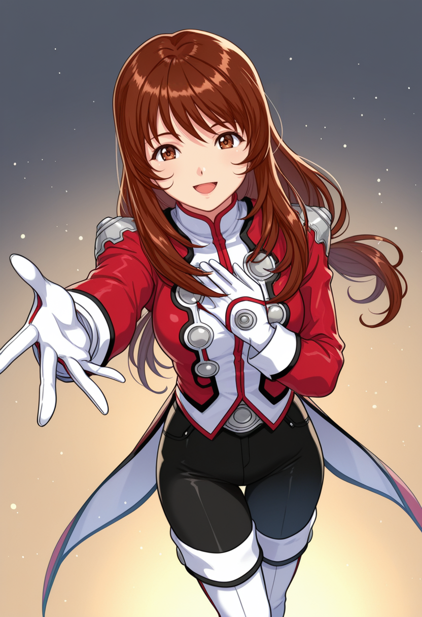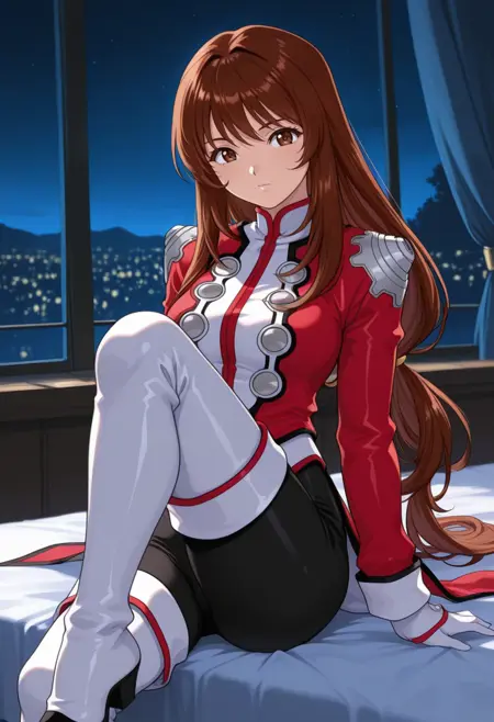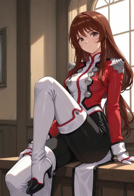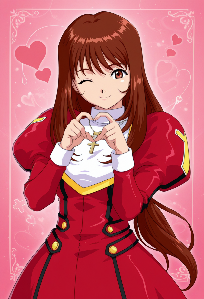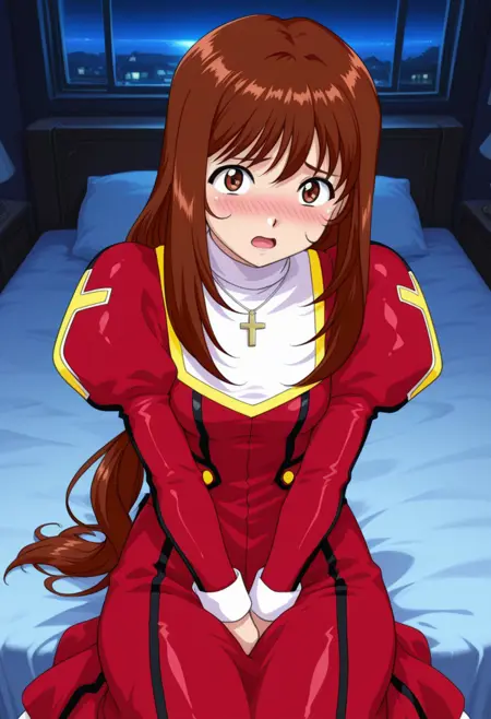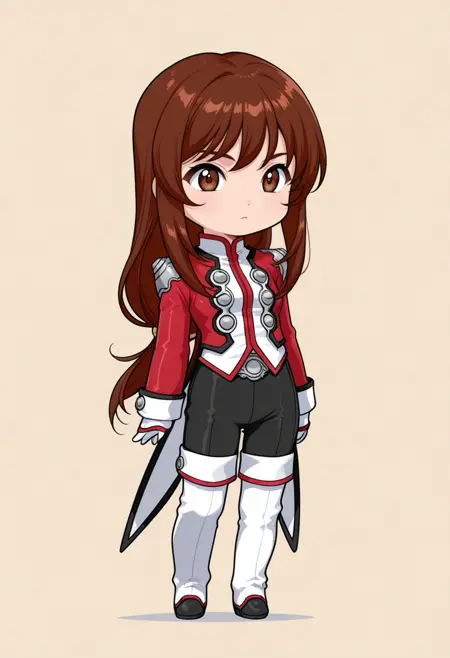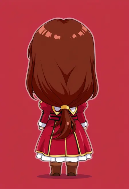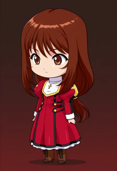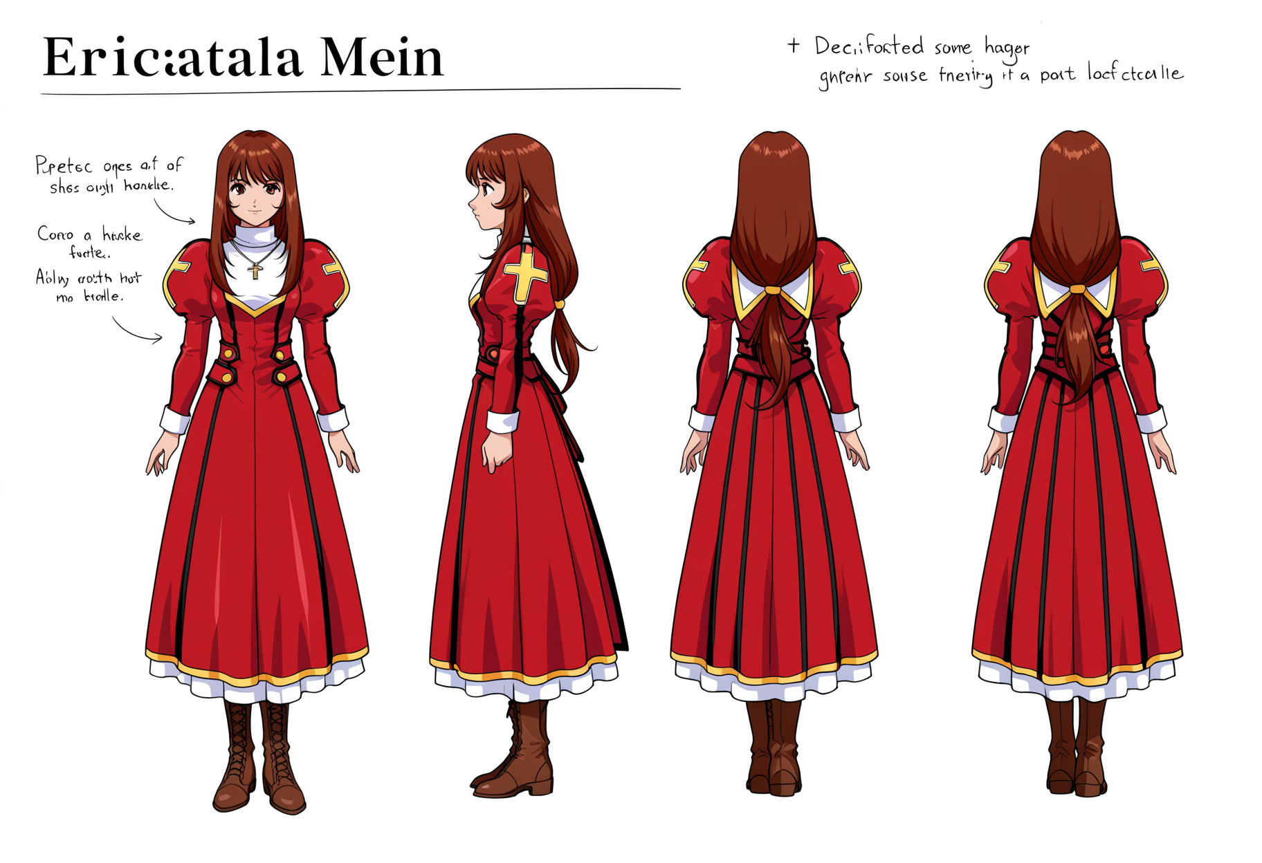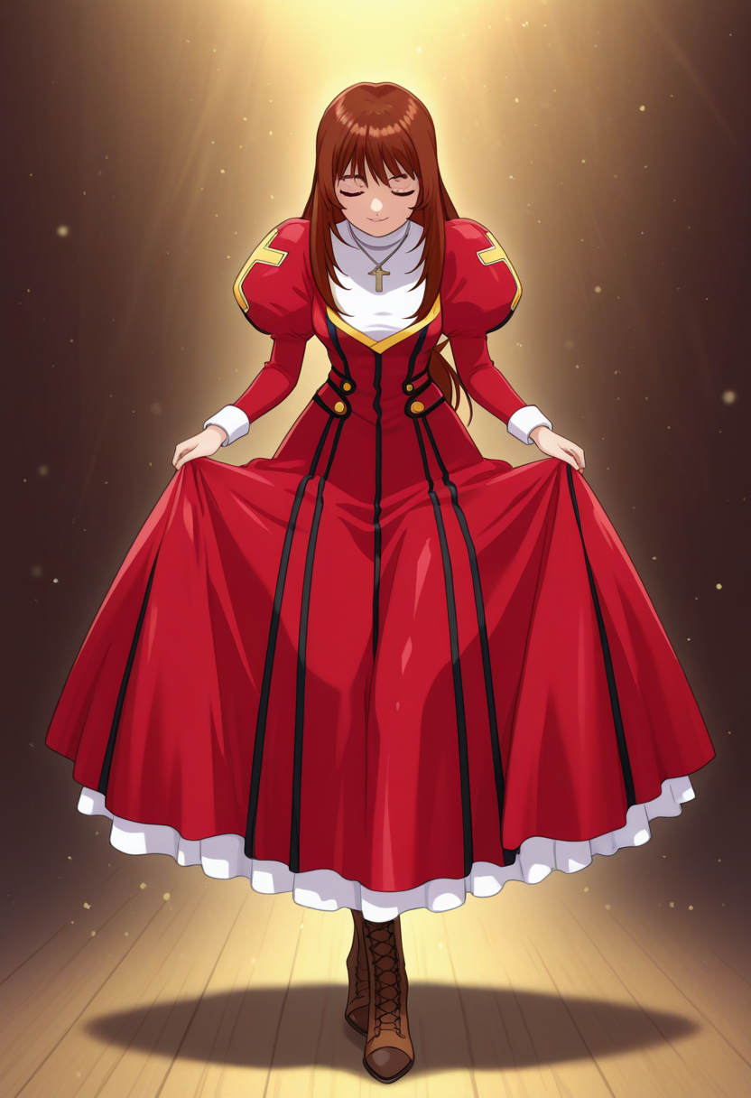 defaultcostume, 긴 소매, 줄리엣 소매, 퍼프 소매, 빨간 드레스, 목걸이, 보석, 십자가 목걸이, 부츠, 갈색 신발,