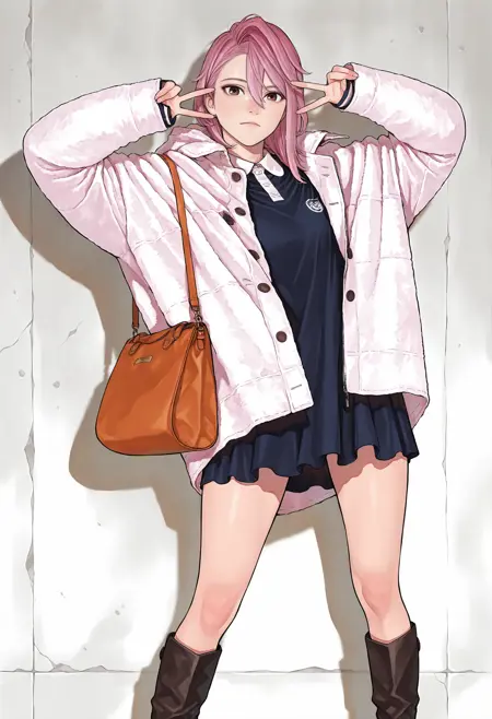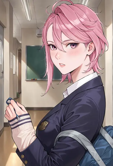 外見: AiraNo1,1girl,ピンクの目,パープルの目,ピンクの髪,短い髪,アホ毛,前髪,ミディアムヘア,ロングヘア,目の間の髪,非対称な髪型,非対称な前髪