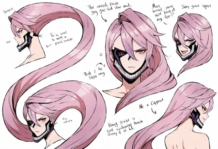 外見: AiraAw2,1girl,ピンクの髪,ピンクの目,パープルの目,パープルの髪,目の間の髪,ロングヘア,前髪,巻きつく髪,ドリル髪,まつげ,マスク,非常に長い髪,異常に長い髪,アイパッチ,マウスマスク