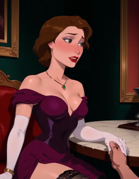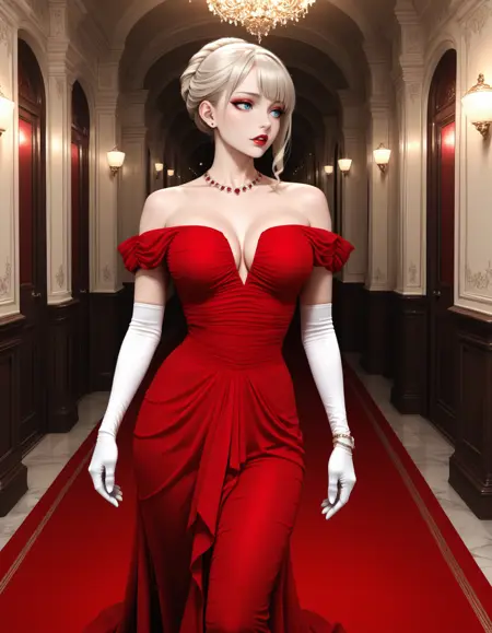 ruched satin, red dress, off-shoulder dress, draped waist, medium breasts, bracelet, white elbow gloves, ruby necklace, fine fabric emphasis