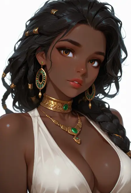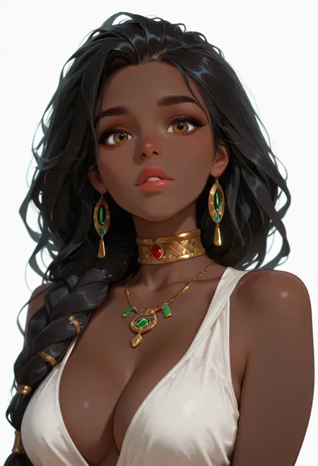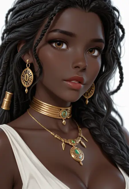 panther woman, char1, 1girl, dark skin, solo, dark-skinned female, dreadlocks, jewelry, black hair, earrings, very dark skin, long hair, brown eyes, breasts, lips, white background, necklace, braid, cleavage, parted lips, looking at viewer, simple background, neck ring, upper body