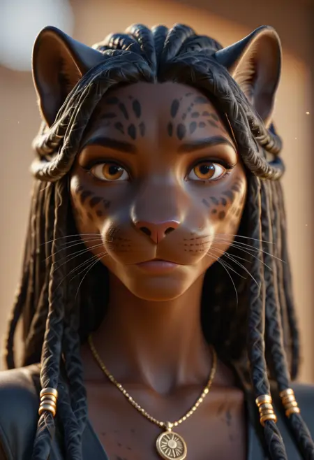 panther woman, char1, dreadlocks, solo, jewelry, necklace, whiskers, animal ears, brown eyes, looking at viewer, male focus, furry, portrait, cat ears, blurry, black hair, dark skin