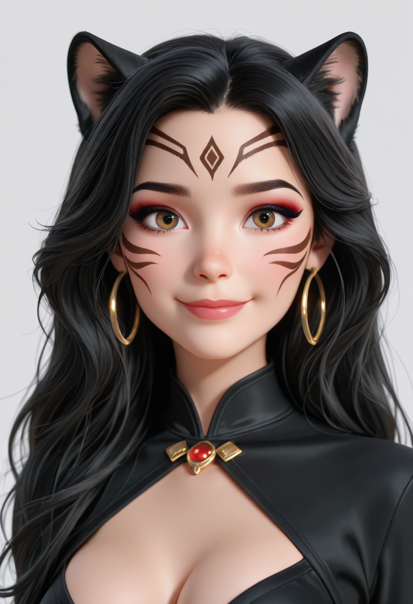 panther woman, char1, 1girl, solo, brown eyes, jewelry, dark-skinned female, earrings, dark skin, mask, black hair, looking at viewer, dreadlocks, long hair, animal ears, necklace, braid, lips, breasts, animification