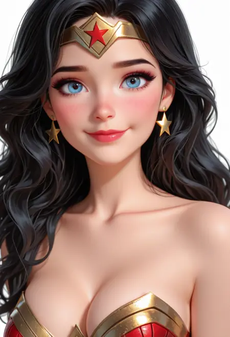 wonder woman, char2, 1girl, breasts, solo, earrings, jewelry, black hair, blue eyes, long hair, cleavage, bare shoulders, white background, superhero, looking at viewer, smile, tiara, collarbone, simple background, upper body, armlet, makeup, lipstick, leotard, medium breasts, star (symbol), strapless, red lips, circlet, lips