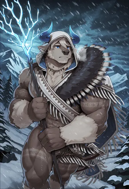 bull, minotaur, two-tone fur, grey fur, white hair, blue eyes, blue horns, beard, facial hair, tattoo, arm tattoo, leg tattoo, pubic tattoo, male, muscular male