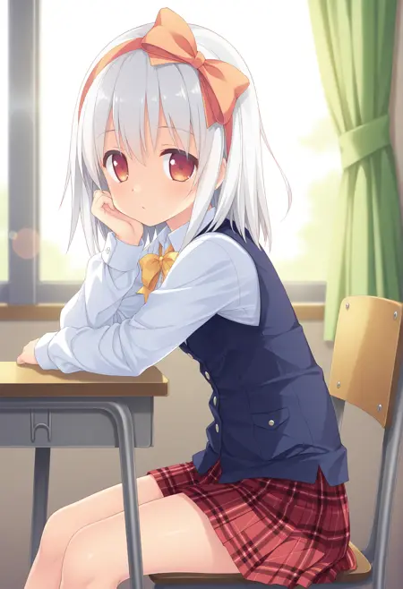 orange hairband,bow hairband,orange bow,school uniform,plaid skirt,pleated skirt,yellow bowtie,long sleeves,blue vest,white shirt,collared shirt,dress shirt,red skirt,miniskirt,