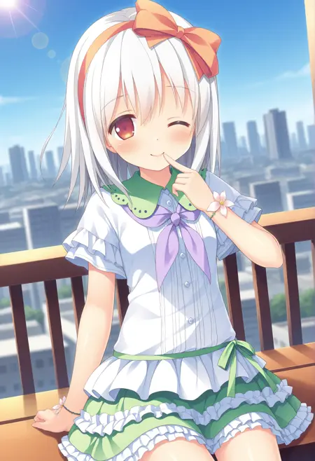 orange hairband,bow hairband,orange bow,casual,short sleeves,green skirt,green collar,frilled sleeves,purple neckerchief,waist ribbon,green ribbon,white shirt,frilled skirt,white frills,miniskirt,layered skirt,wrist flower,