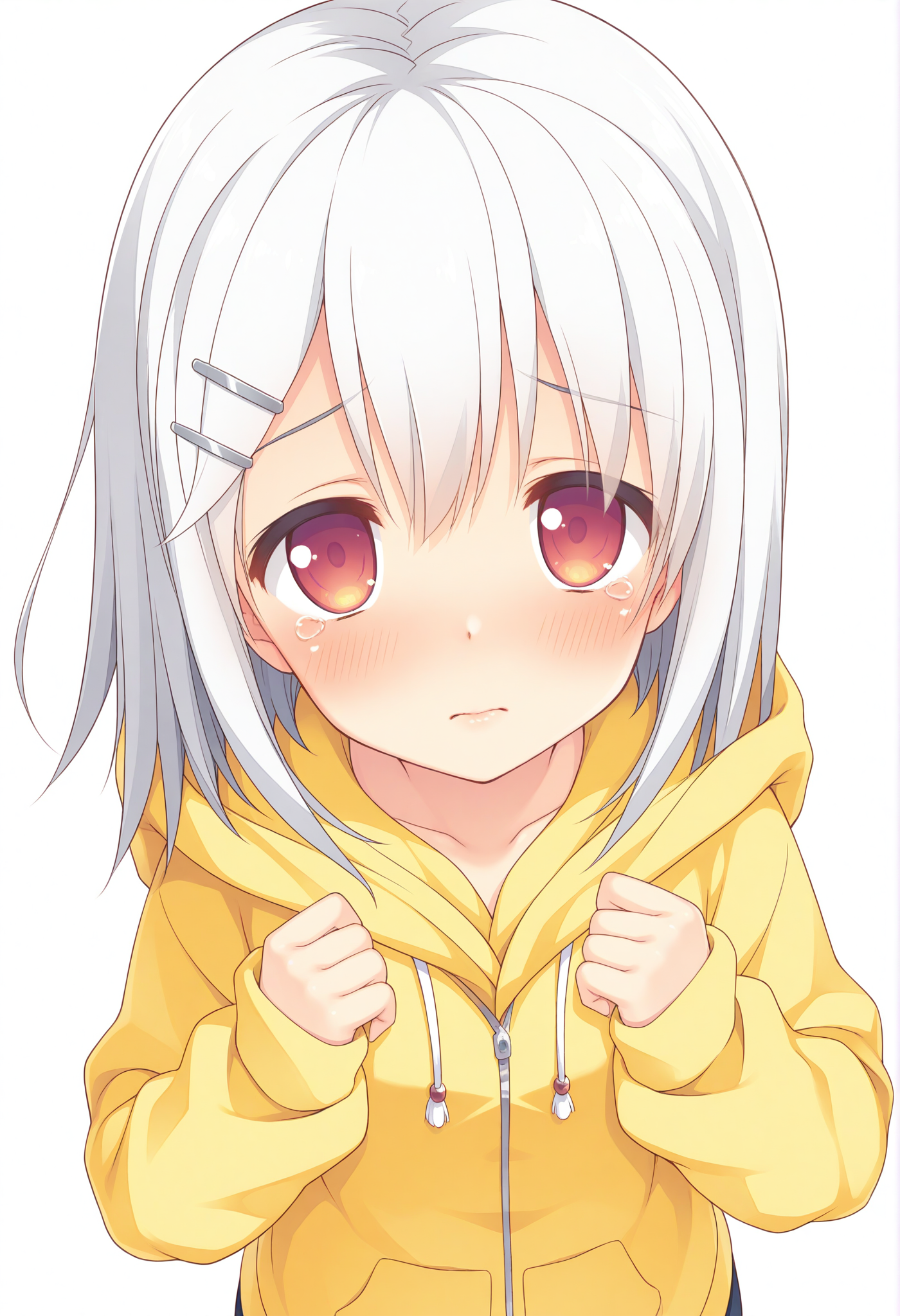 parallel hairclips,silver hairclip,yellow hoodie,long sleeves,hood down,