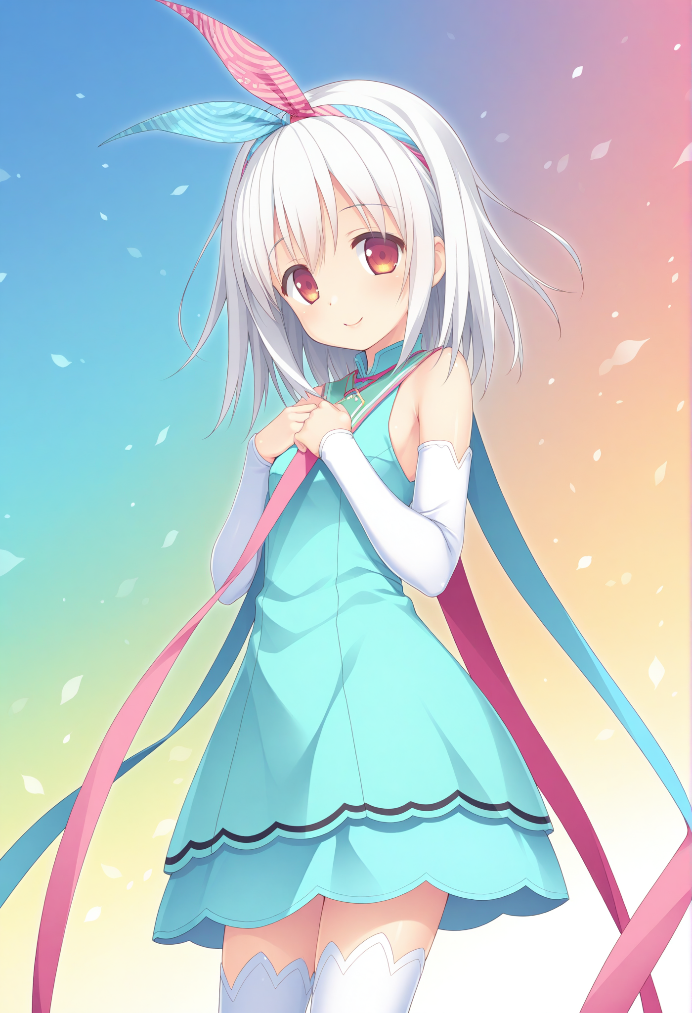 two-tone hairband,rabbit ear hairband,magical girl,sleeveless dress,white thighhighs,detached sleeves,pink ribbon,short dress,white sleeves,aqua dress,long sleeves,dress ribbon,aqua ribbon,ring,