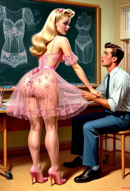 The concept of a beautiful woman teaching lingerie design to students in a retro classroom. She sketches lingerie design ideas on a chalkboard, while modelling fine lingerie herself.