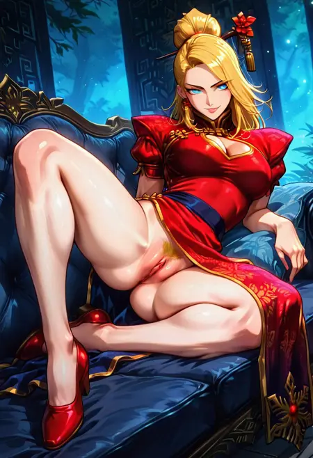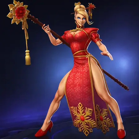 LunarJainaHoTS, 1girl, ソロ, 金髪, 長髪, 髪飾り, 髪止め, 髪の花, 前髪, 青い目, 厚い唇, 中国風衣装, 中国風ドレス, 大きい胸, 胸元の切り替え, 金飾り, 金のアクセントが施されたエレガントな赤いドレス, 高めの襟, 厚い太もも, 金の花模様が施された魔力の杖, 赤い靴,