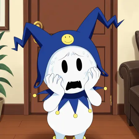 blue hat, pointed hat, yellow face on hat, blue collar, blue footwear