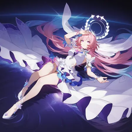 CyreneHSR, 보라색 눈, 다이아몬드 모양의 동공, 매우 긴 머리카락, 연한 파란색 머리카락, 그라데이션 머리카락, 환상, 베일, 줄무늬 머리카락, 흰색 줄무늬, 분홍색 머리카락, 흰색 드레스, 소매 없는 드레스, 흰색 꽃, 파란색 꽃, 분홍색 꽃, 머리꽃, 머리 장식, 가슴 보석, 보석, 다색 보석, 팔찌, 드러난 어깨, 보석류, 분리된 소매, 주름진 소매, 허벅지 장식, 흰색 허벅지 장식, 드레스 꽃, 짧은 소매, 목 리본, 목 꽃, 그라데이션 리본, 분홍색 리본, 손목 리본, 손목 꽃, 흰색 스트랩, 장미, 측면 절개, 주름진 치마, 하이-로우 드레스, 양면 치마, 흰색 치마, 층층이 된 치마, 하트 장식, 흰색 신발, 하이힐, 발목 장식, 발목 꽃,