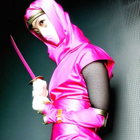ninja pink, pink ninja hood, makeup, pink ninja mask, fishnet bodysuit, pink short kimono, pink obi, pink fingerless gloves, pink elbow guard, pink high boot
