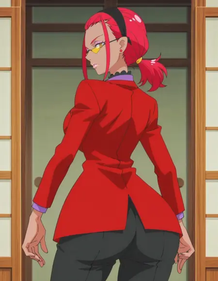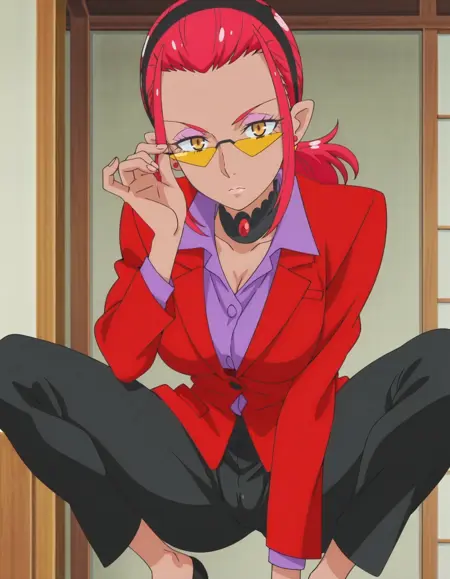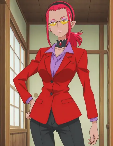 anime screencap, solo,1girl,jotengu,glasses, sunglasses, formal,red suit,black pants,chorker,earringlora:jotengu_IL:0.8 high definition,amazing quality,best quality,very aesthetic,masterpiece,absurdres,