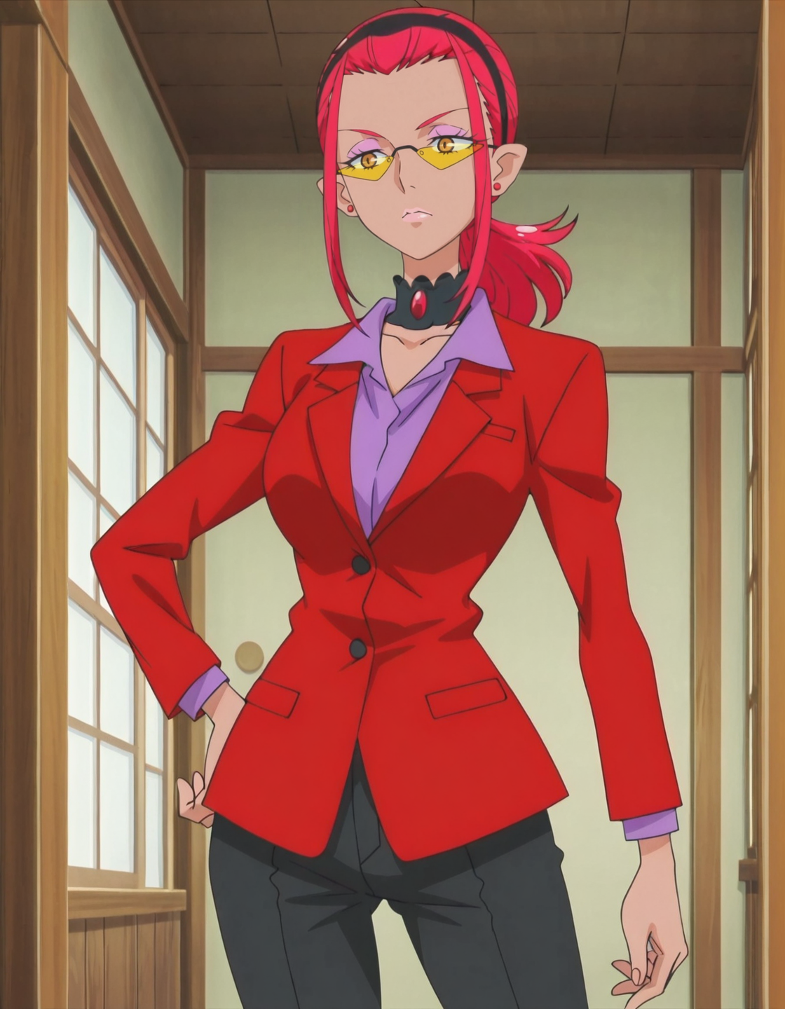 anime screencap, solo,1girl,jotengu,glasses, sunglasses, formal,red suit,black pants,chorker,earringlora:jotengu\_IL:0.8 high definition,amazing quality,best quality,very aesthetic,masterpiece,absurdres,