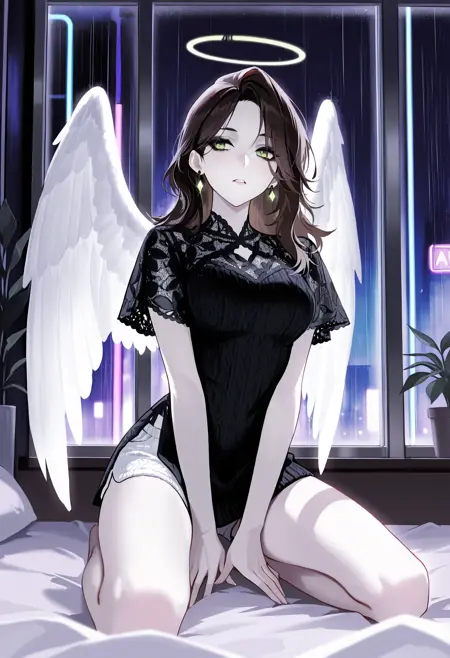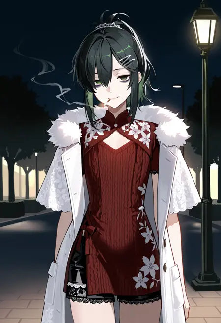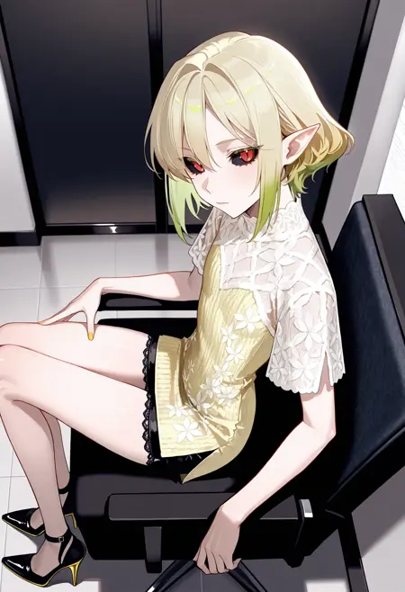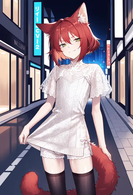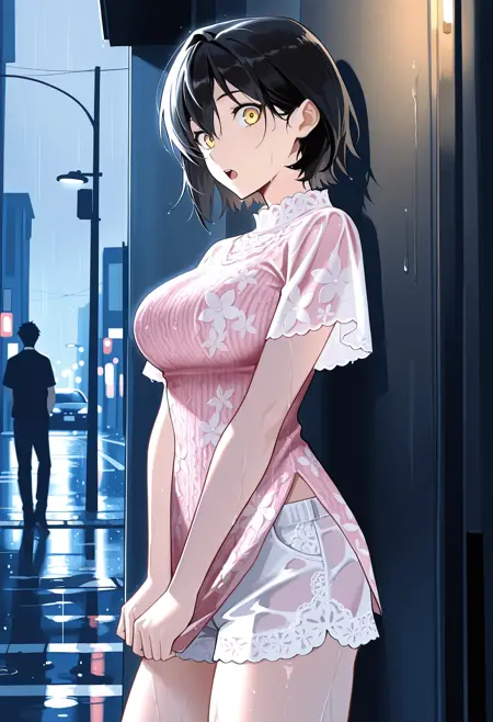Trigger word: knitted, short dress, knitted dress, lace dress, floral print dress, short sleeves, short shorts, (knitted shorts):1.2,