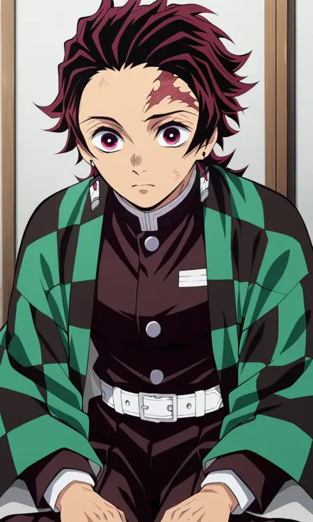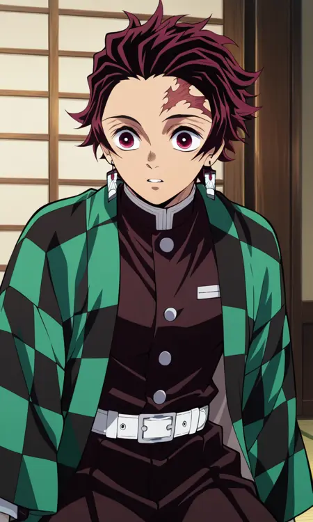 tanjiro kamado,1boy,solo,red hair, red eyes, scar on forehead, earrings,green haori,lattice haroi,demon slayer uniform,black jacket, wide sleeves, buttons, white belt, puffy pants, black pants,male focus,