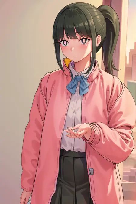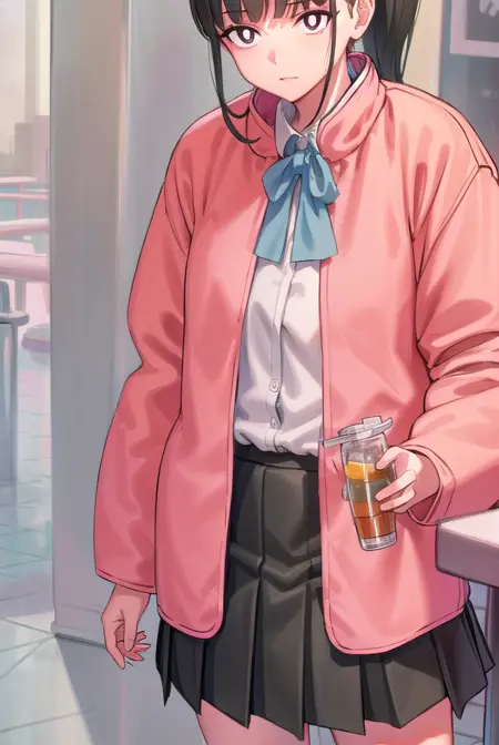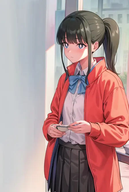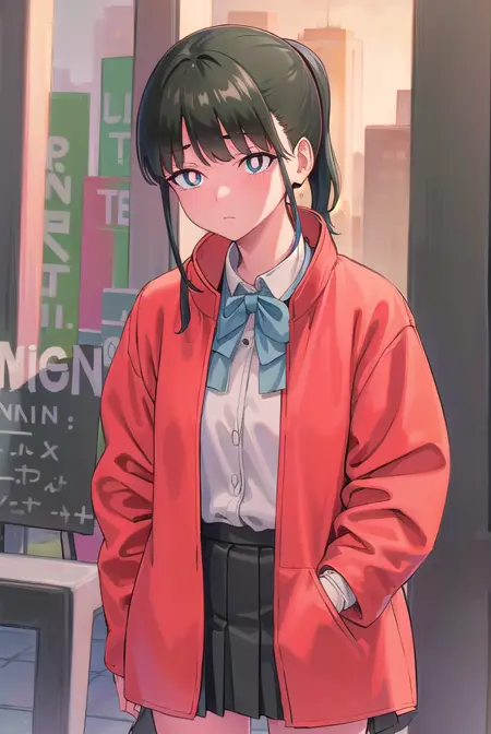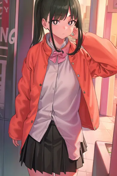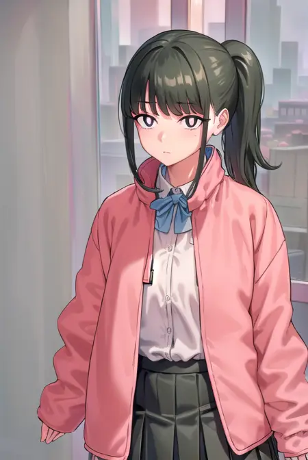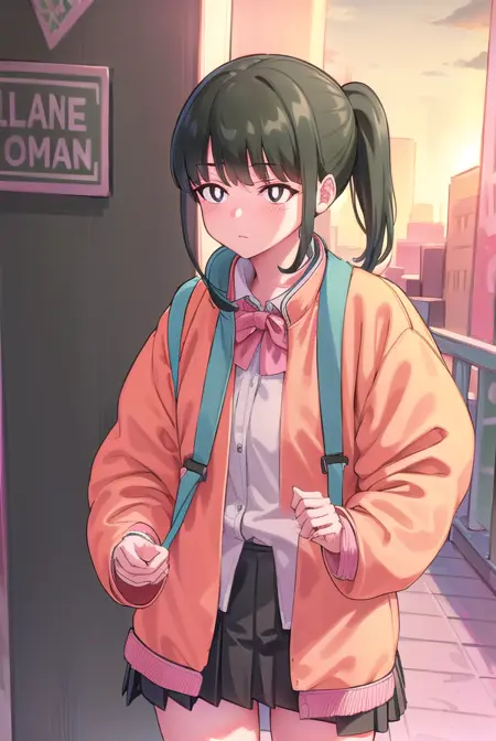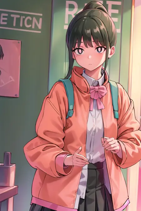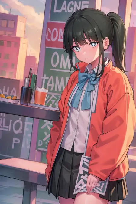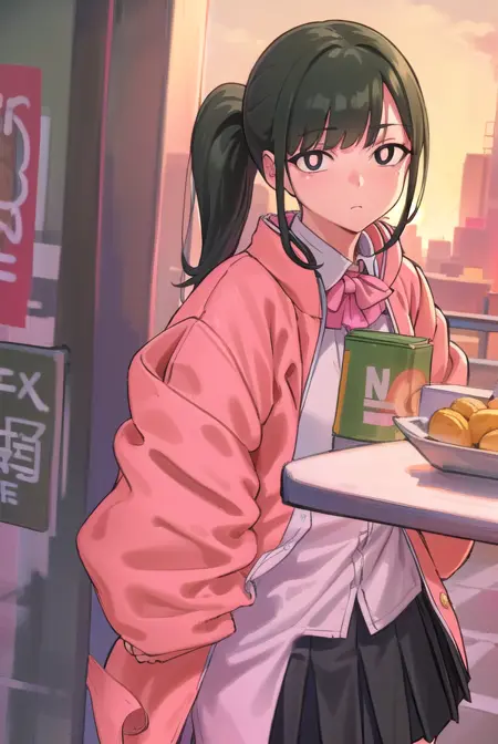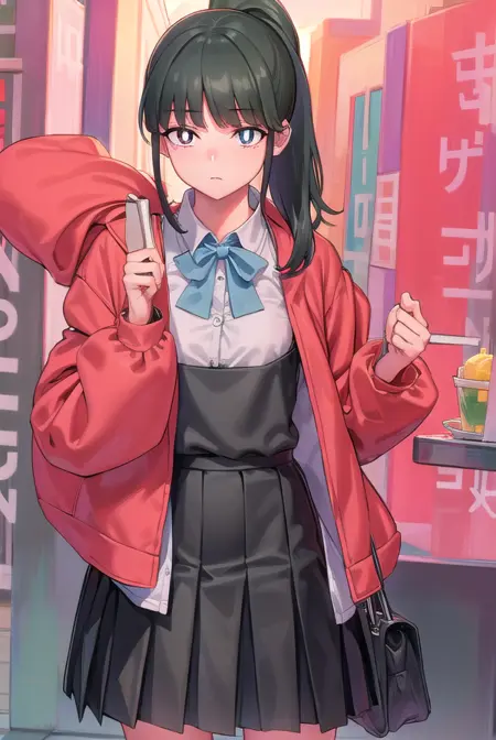 yoru mac girlfriend、前髪、黒髪、ポニーテール、側髪、(黒い目:1.2)、(明るい瞳孔:1.5)、