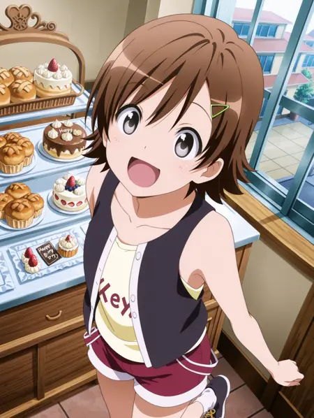 복장: 어깨 노출, 캐주얼, 노란 티셔츠, 조끼, 빨간 반바지, 옷에 글자, 콧볼, 흰 양말, 신발